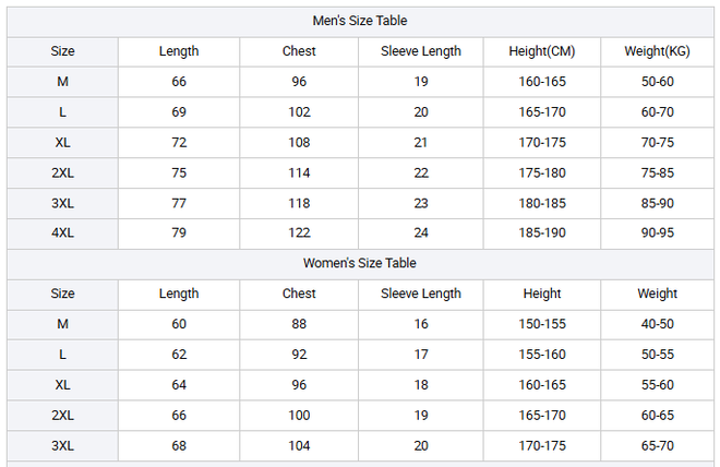M, L, XL, 2XL, 3XL, 4XL (Men)